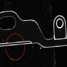 樣品為五金件,主要檢測凸起部分尺寸。因?yàn)闃悠酚悬c(diǎn)圓角,因此用環(huán)形0度光源能夠把整個(gè)圓角體現(xiàn)出來,且效果與周圍形成鮮明對比。